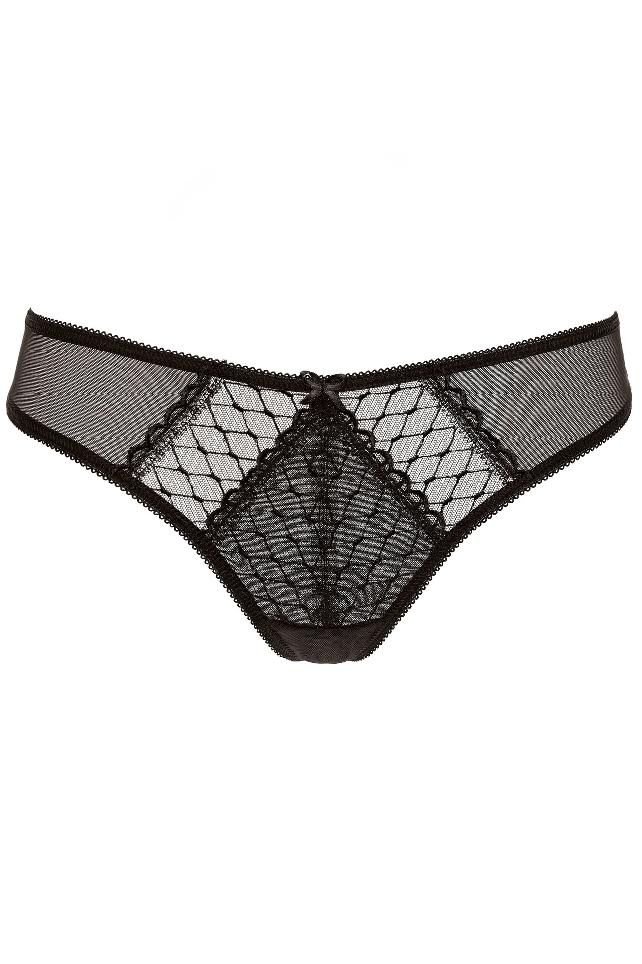 Kuszące stringi wykonane z dzianiny gładkiej oraz subtelnego haftu. Kokardka w czarnym kolorze umieszczona z przodu bielizny dodaje jej niezwykłego uroku.