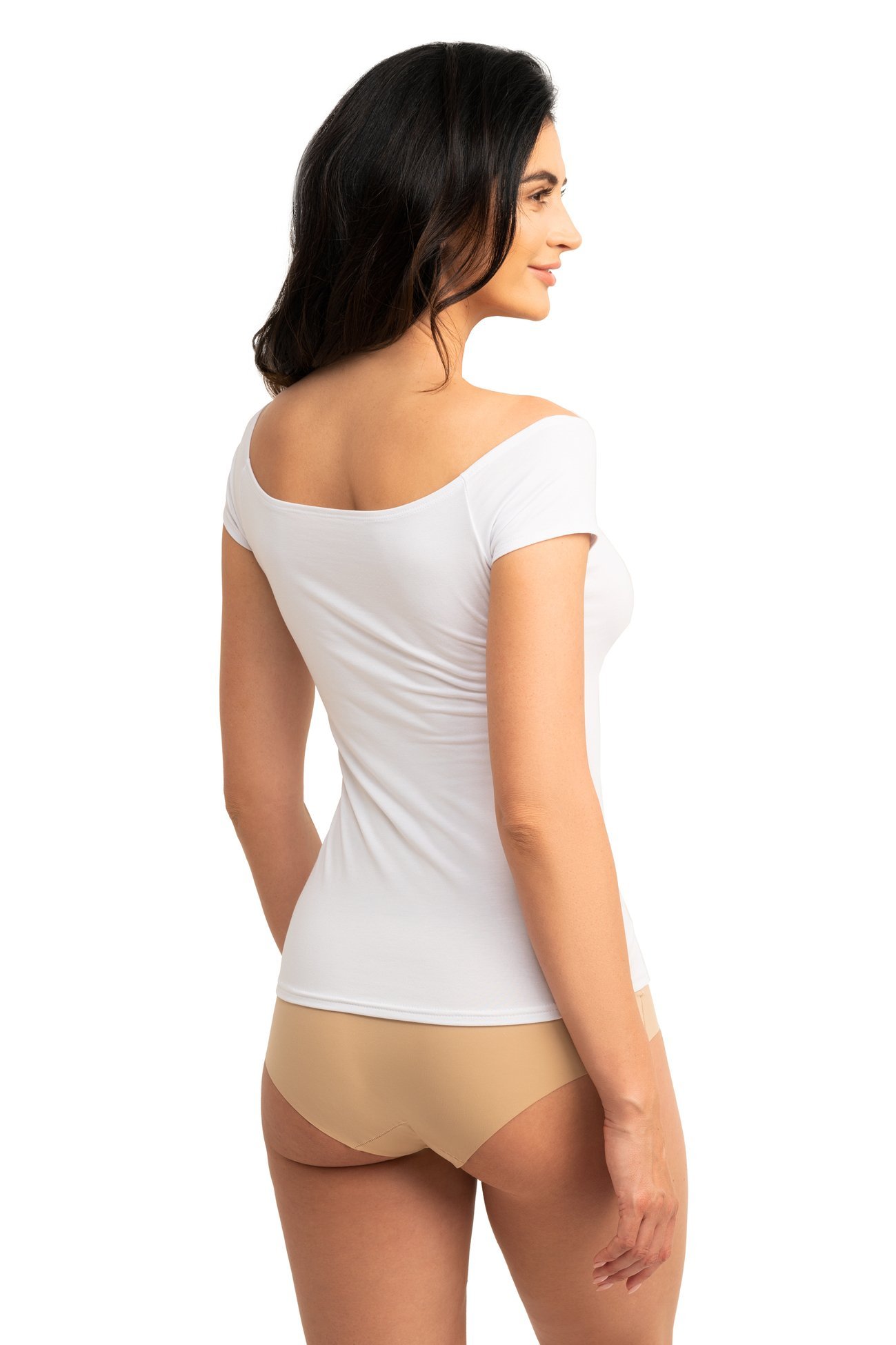 Bluzka damska z krótkim rękawem, gładka, wykonana z miękkiej i elastycznej wiskozy z dodatkiem lycry. Idealnie dopasowuje się do ciała zapewniając komfort noszenia.