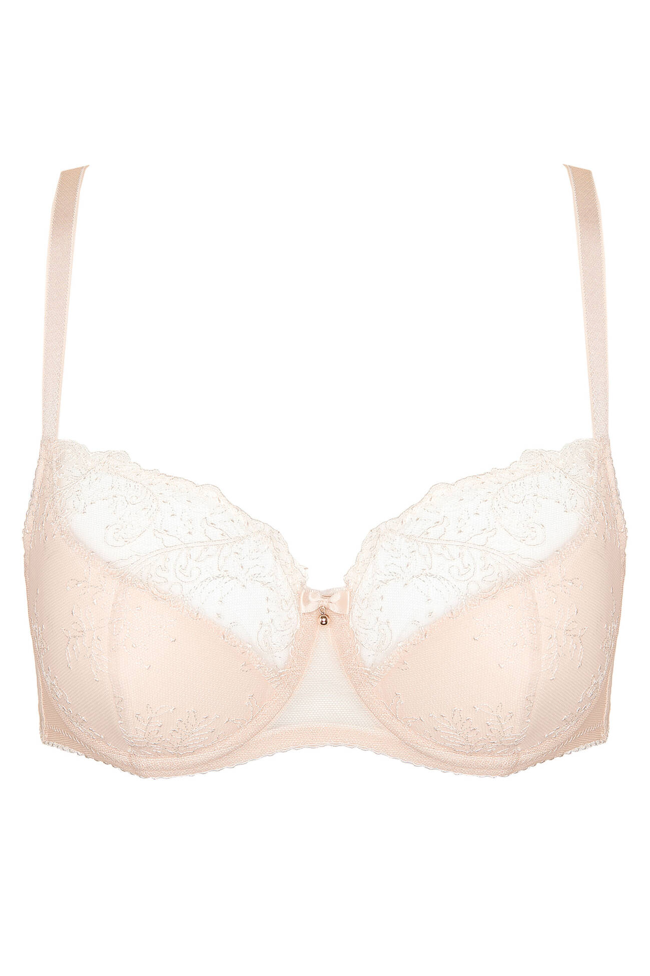Dolna część misek wykonana z cienkiej pianki gorseciarskiej powleczonej haftem, a górna z kwiatowego haftu, dzięki czemu biustonosz doskonale dopasowuje się do kształtu piersi,