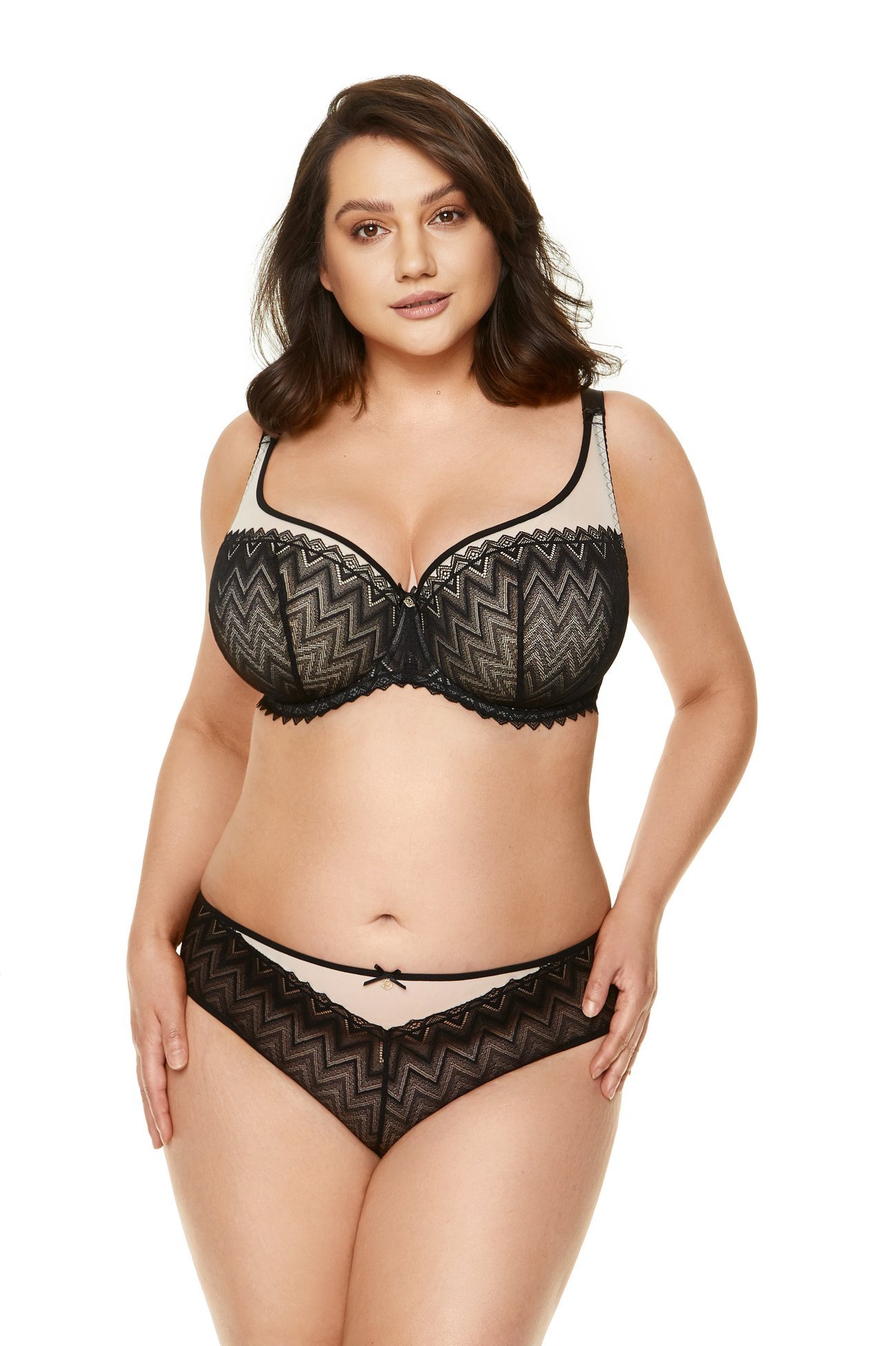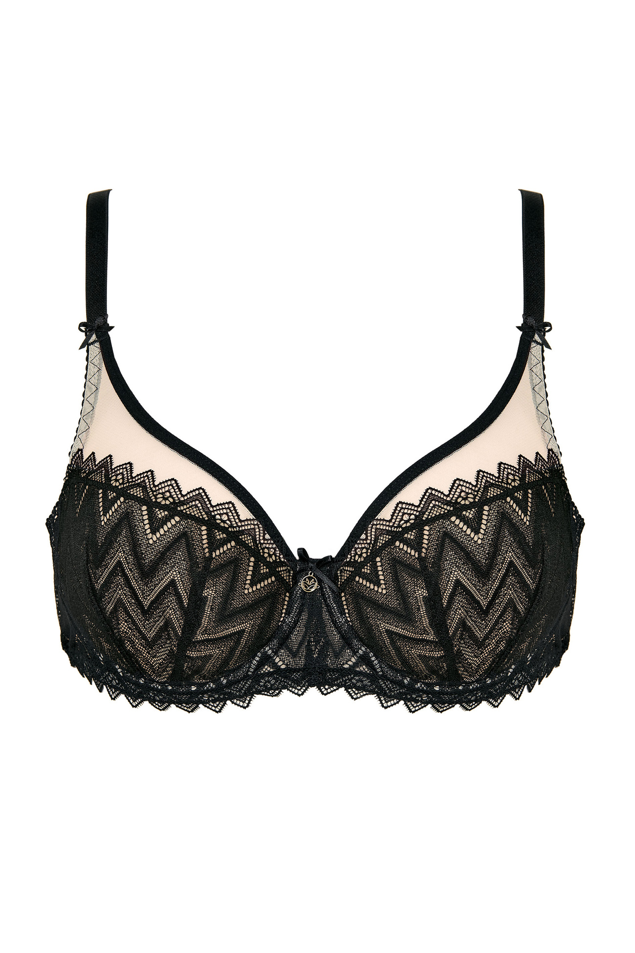 Kobiecy biustonosz usztywniany doskonale modeluje piersi. Miseczki wykonano z pianki gorseciarskiej obszytej koronką w geometryczne wzory.
