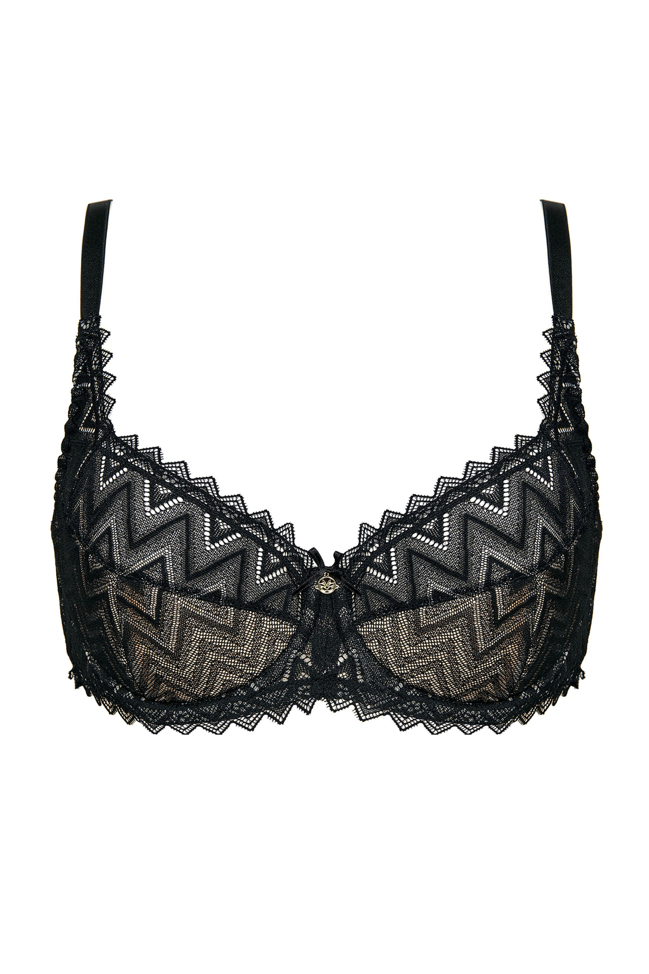 Uwodzicielski biustonosz półusztywniany doskonale modeluje piersi. Miseczki obszyte oryginalną, ozdobną koronką w geometryczne wzory.