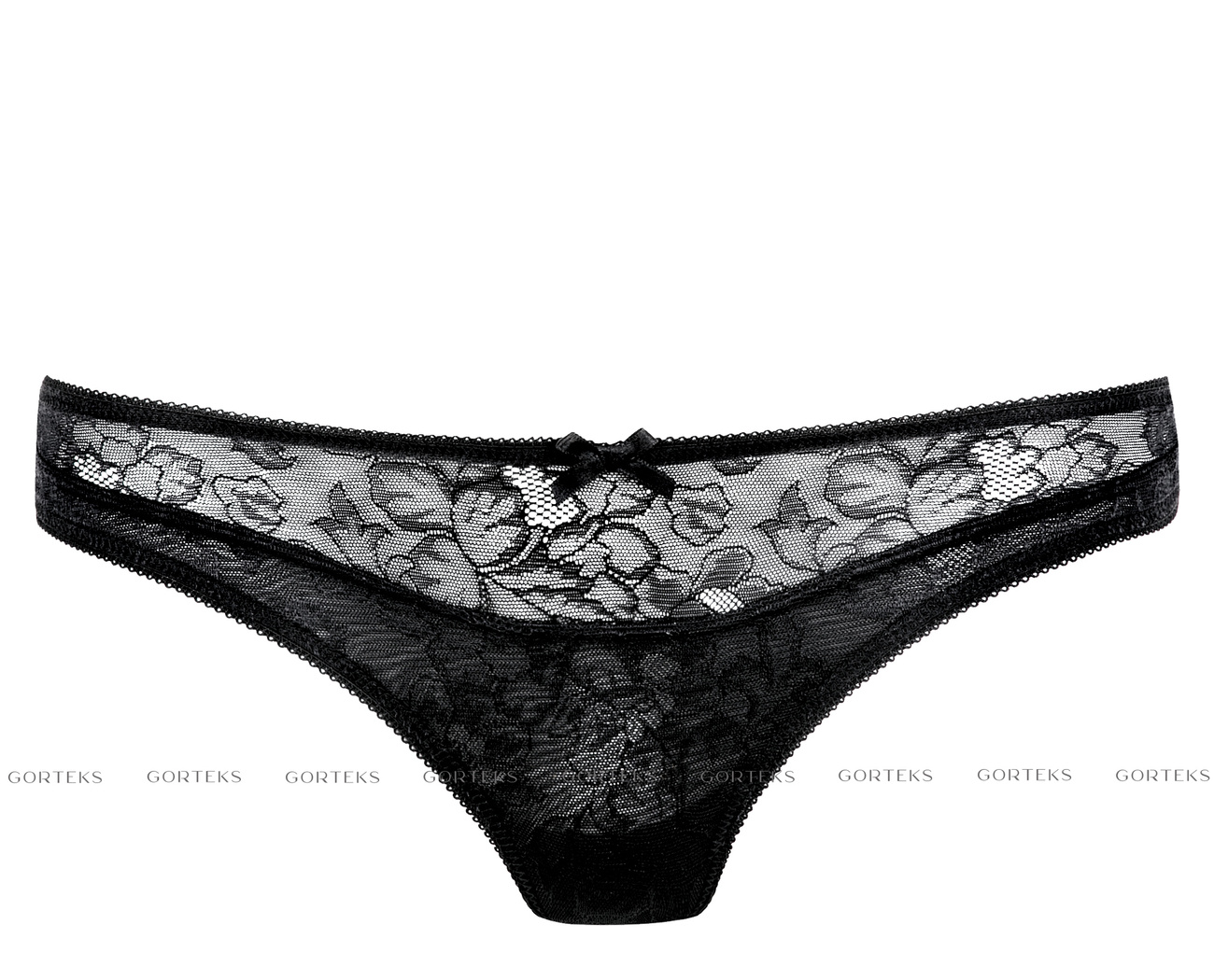 Eleganckie stringi uszyte z połyskliwej, koronkowej dzianiny.