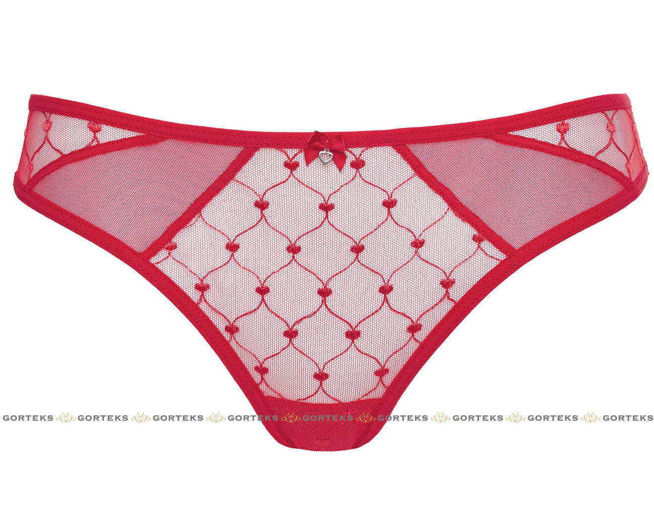 Zmysłowe stringi wykonano z nietuzinkowego plenu pokrytego haftowanymi serduszkami.