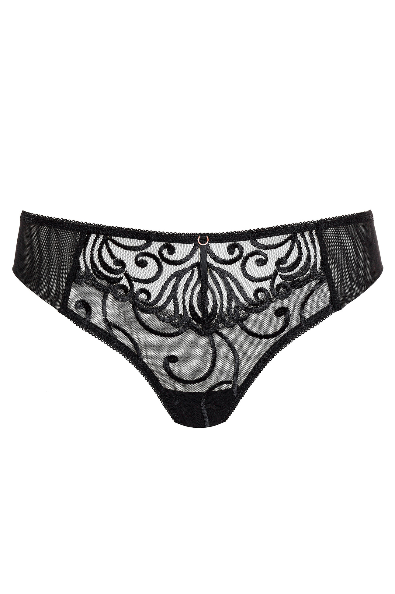 Kuszące stringi wykonano z tiulu elastycznego obszytego ozdobnym haftem.