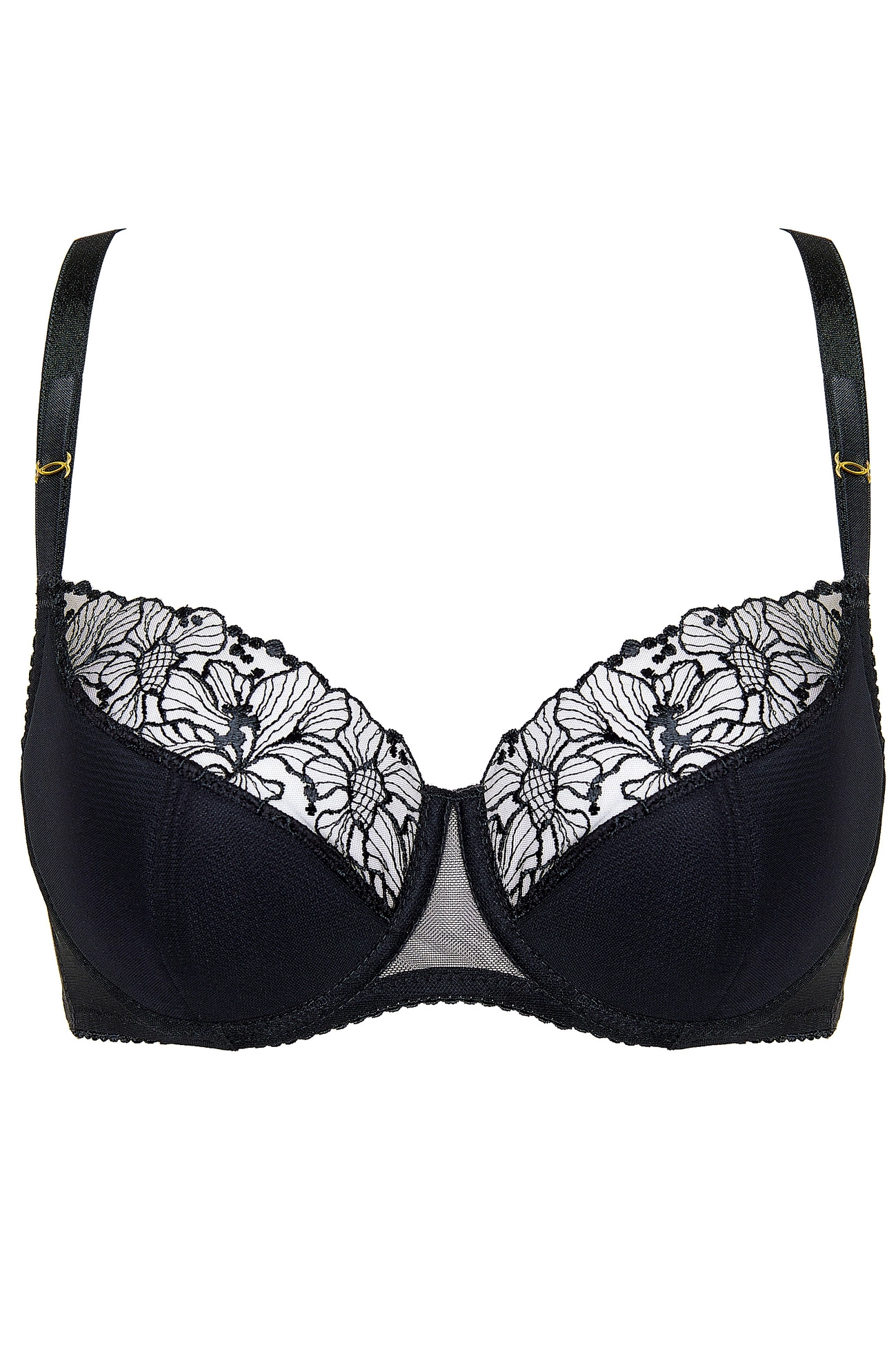 Dolna część misek wykonana z cienkiej pianki gorseciarskiej obszytej tiulem, a górna z ozdobnego haftu, dzięki czemu biustonosz doskonale dopasowuje się do kształtu piersi,