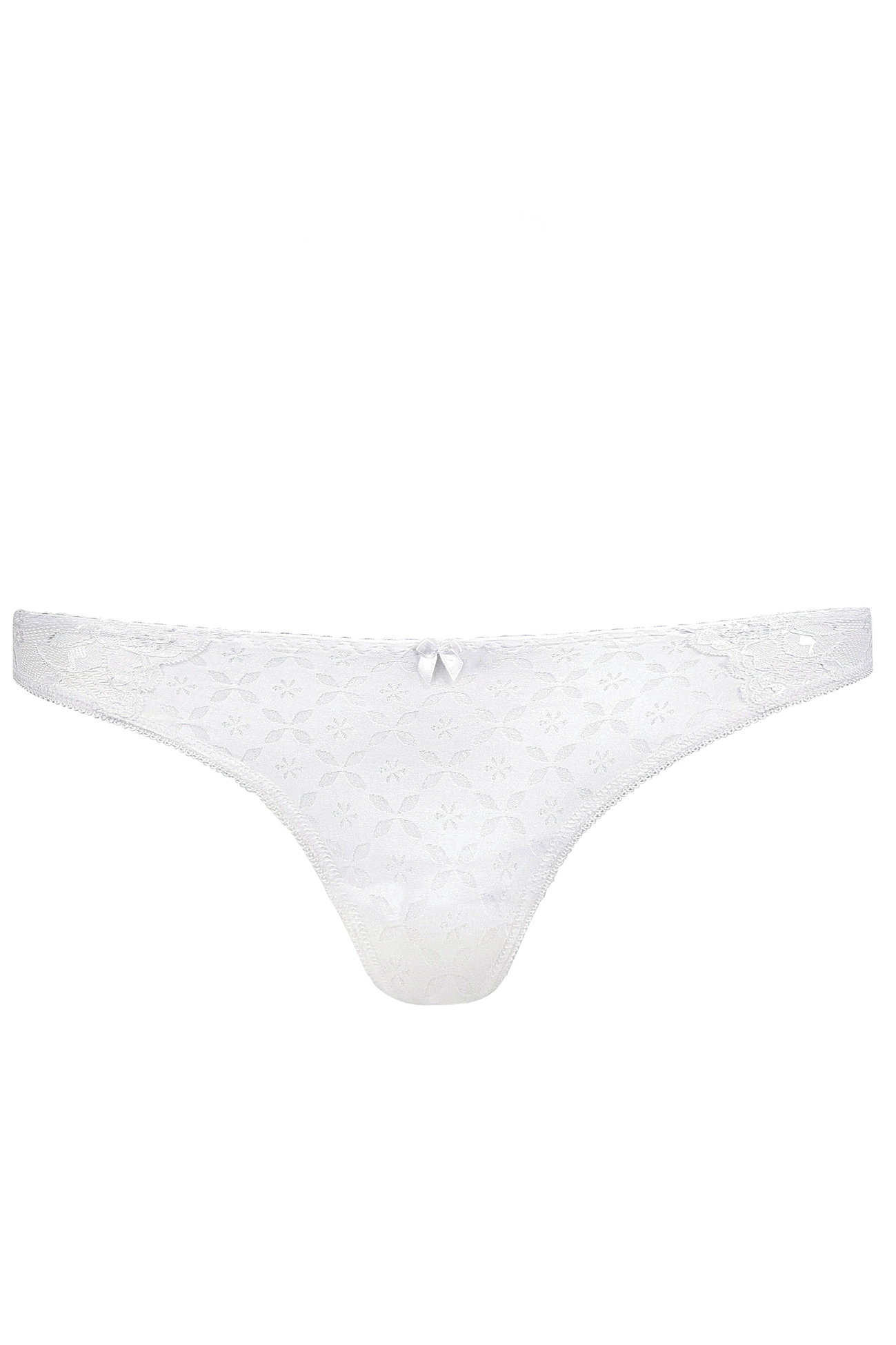 Subtelne stringi wykonane z delikatnej dzianiny typu żakard ozdobionej kwiatowym motywem. Uroku dodaje im piękna koronka zdobiąca boczki.