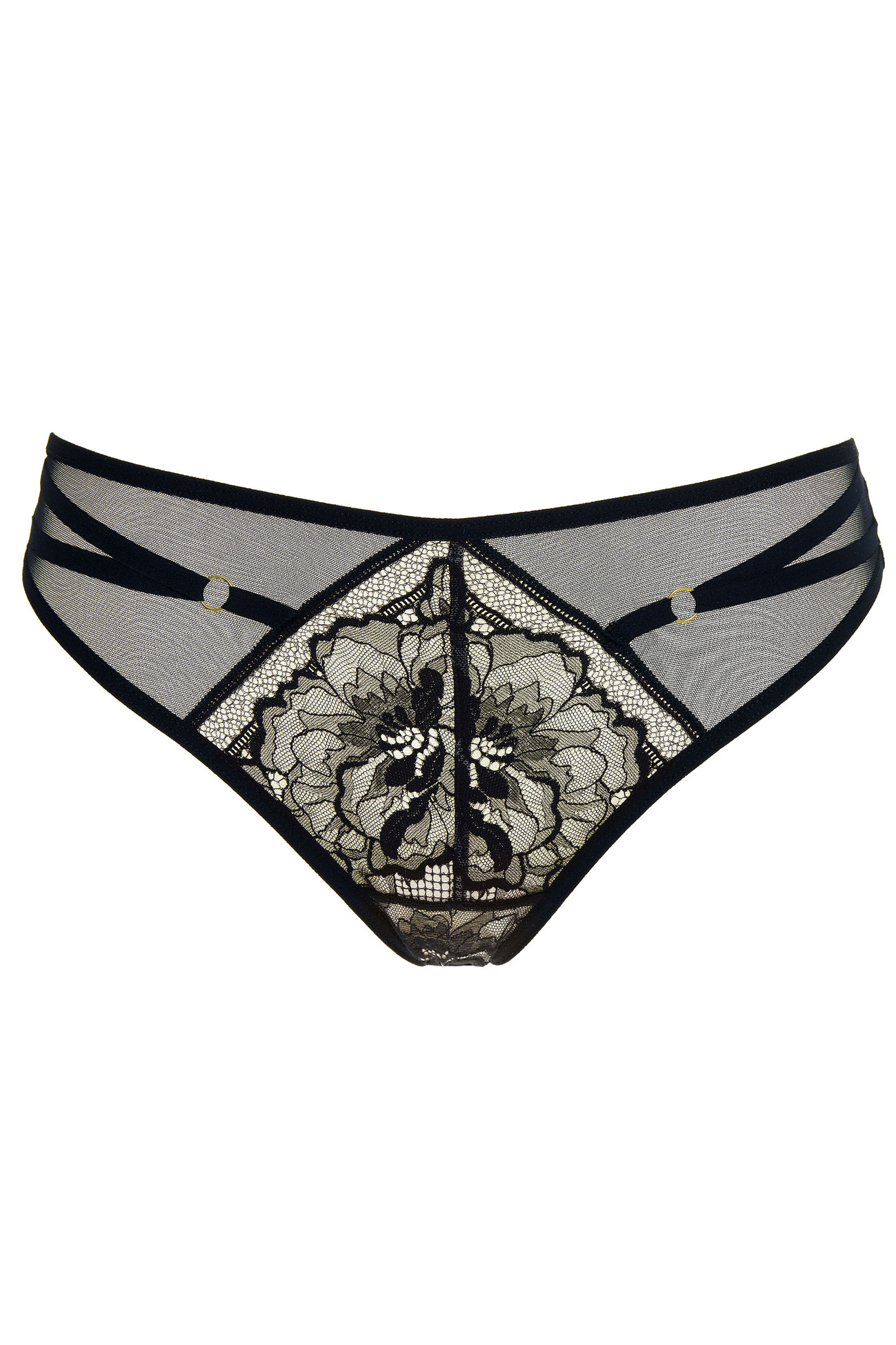 • Ozdobne paseczki i kółka w kolorze złota na przodzie bielizny,