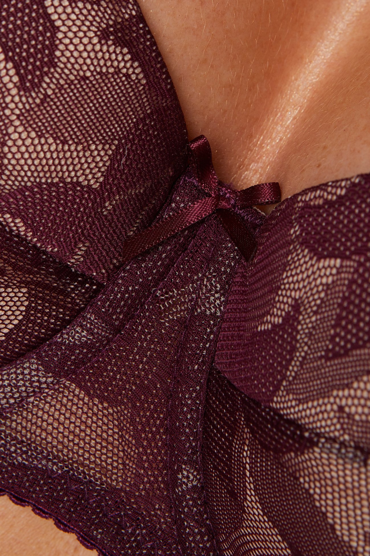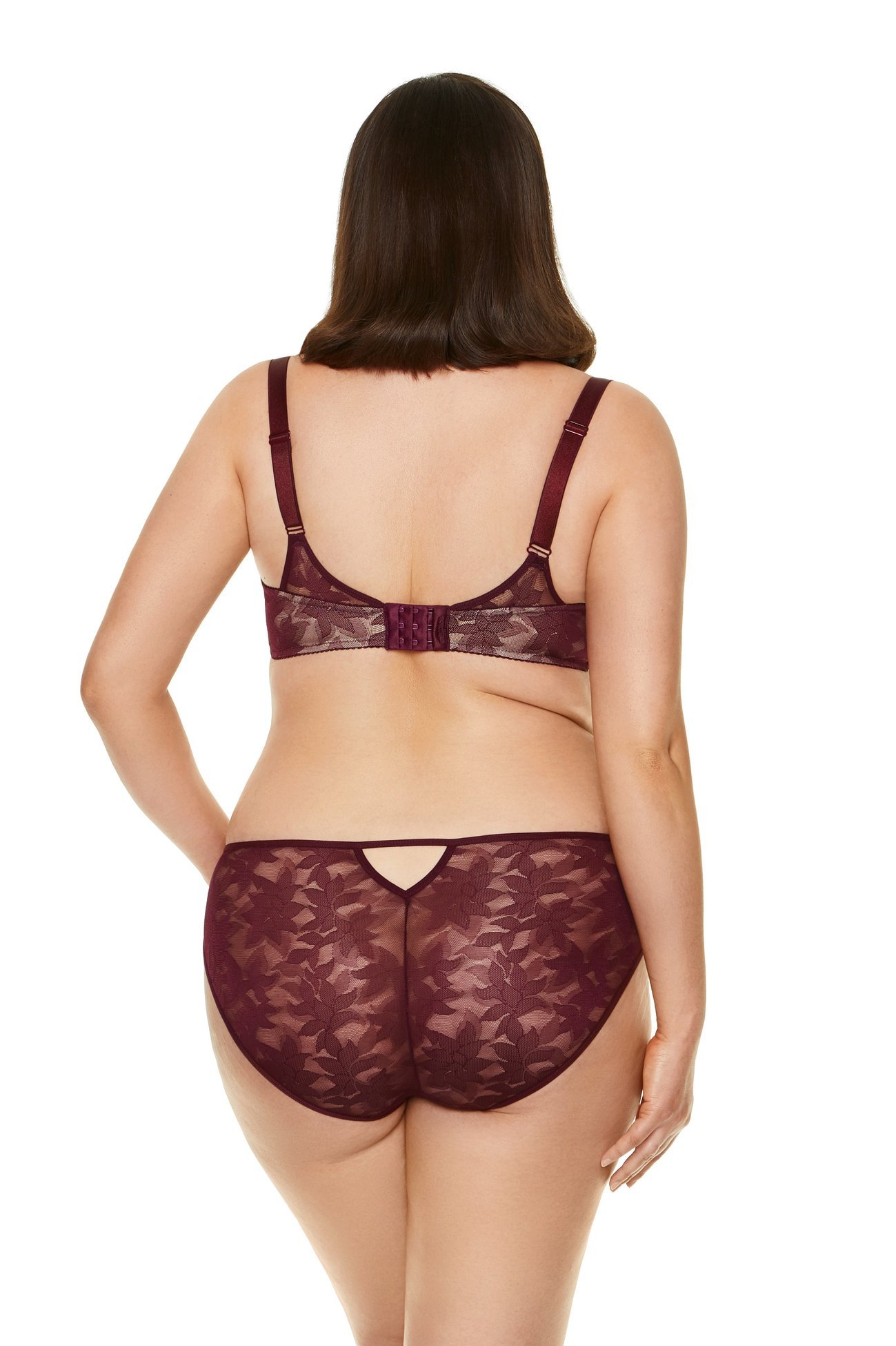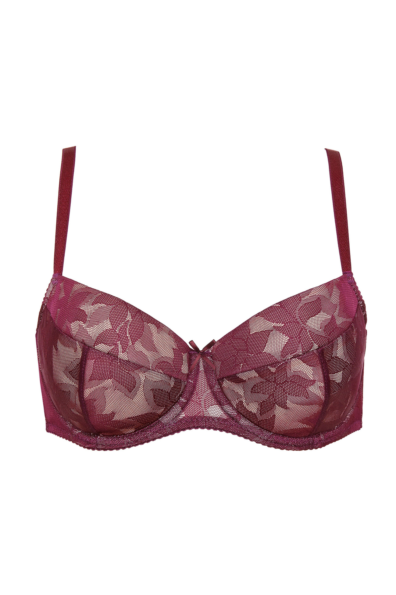 Kobiecy biustonosz usztywniany doskonale podkreśla kształty. Miseczki zostały wykonane z pianki gorseciarskiej pokrytej plenem koronkowym z motywem roślinnym.