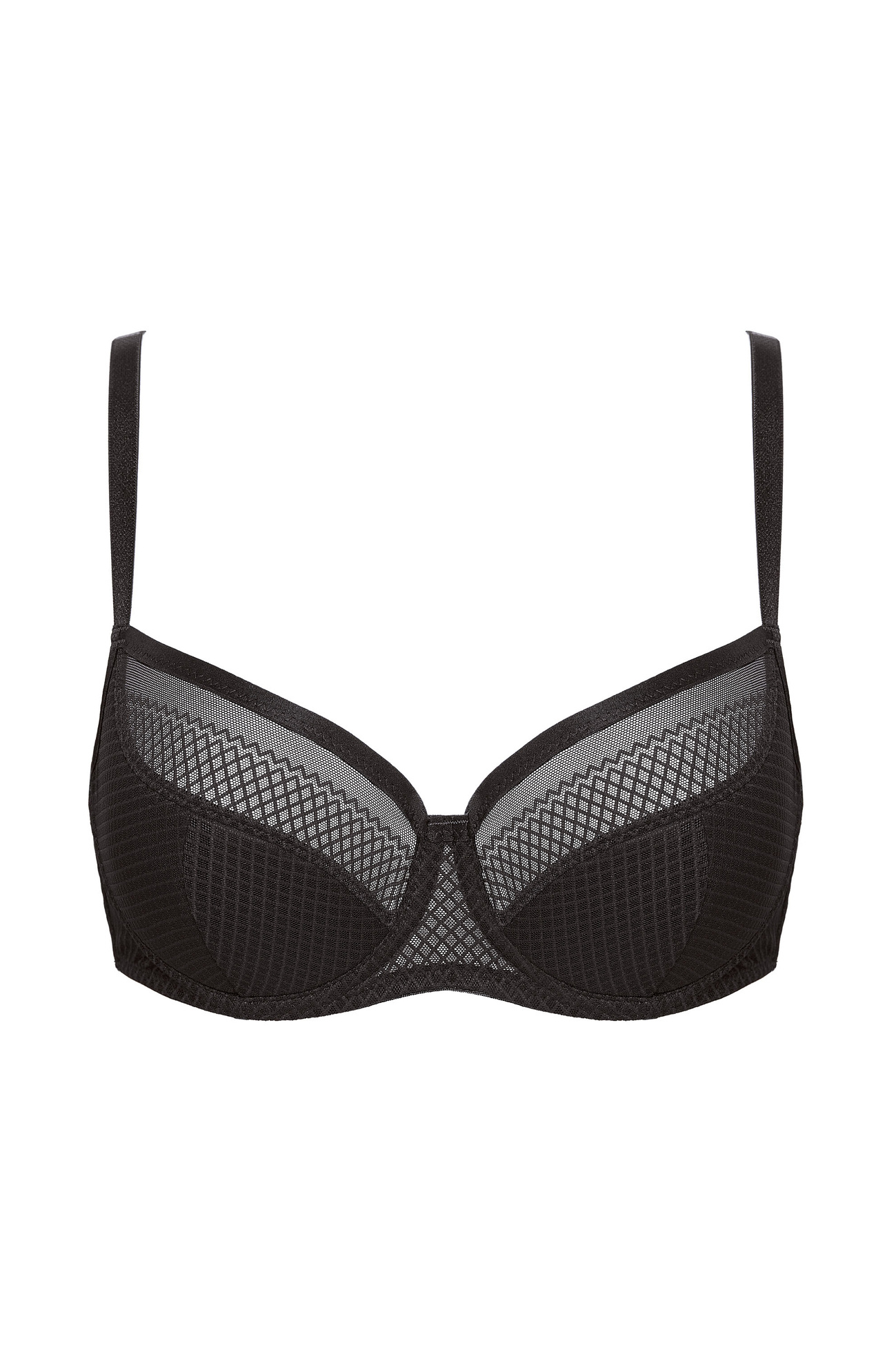 Dolna część misek wykonana z cienkiej pianki gorseciarskiej, a górna z koronki, dzięki czemu biustonosz doskonale okala piersi i ukrywa asymetrię,