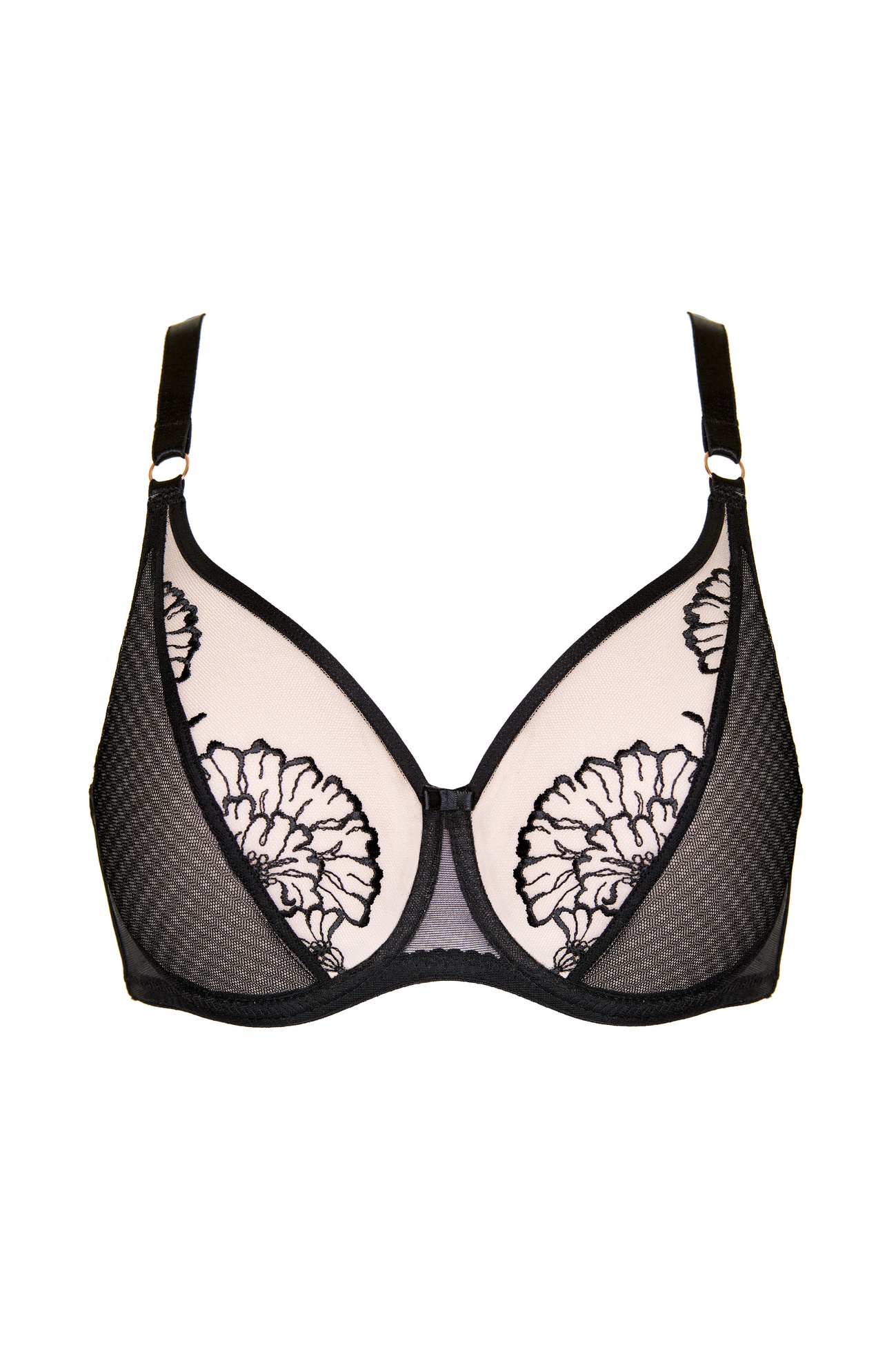 • Prześwitujące, wyciągnięte ku górze, miękkie miseczki z podwójnej siateczki i haftu,