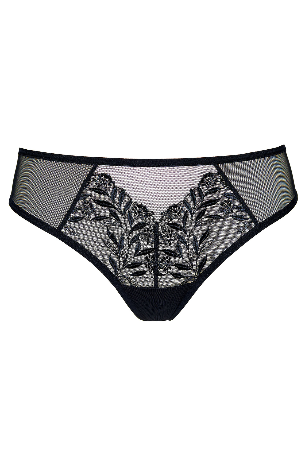 Kobiece stringi wykonano z tiulu elastycznego obszytego ozdobnym haftem.