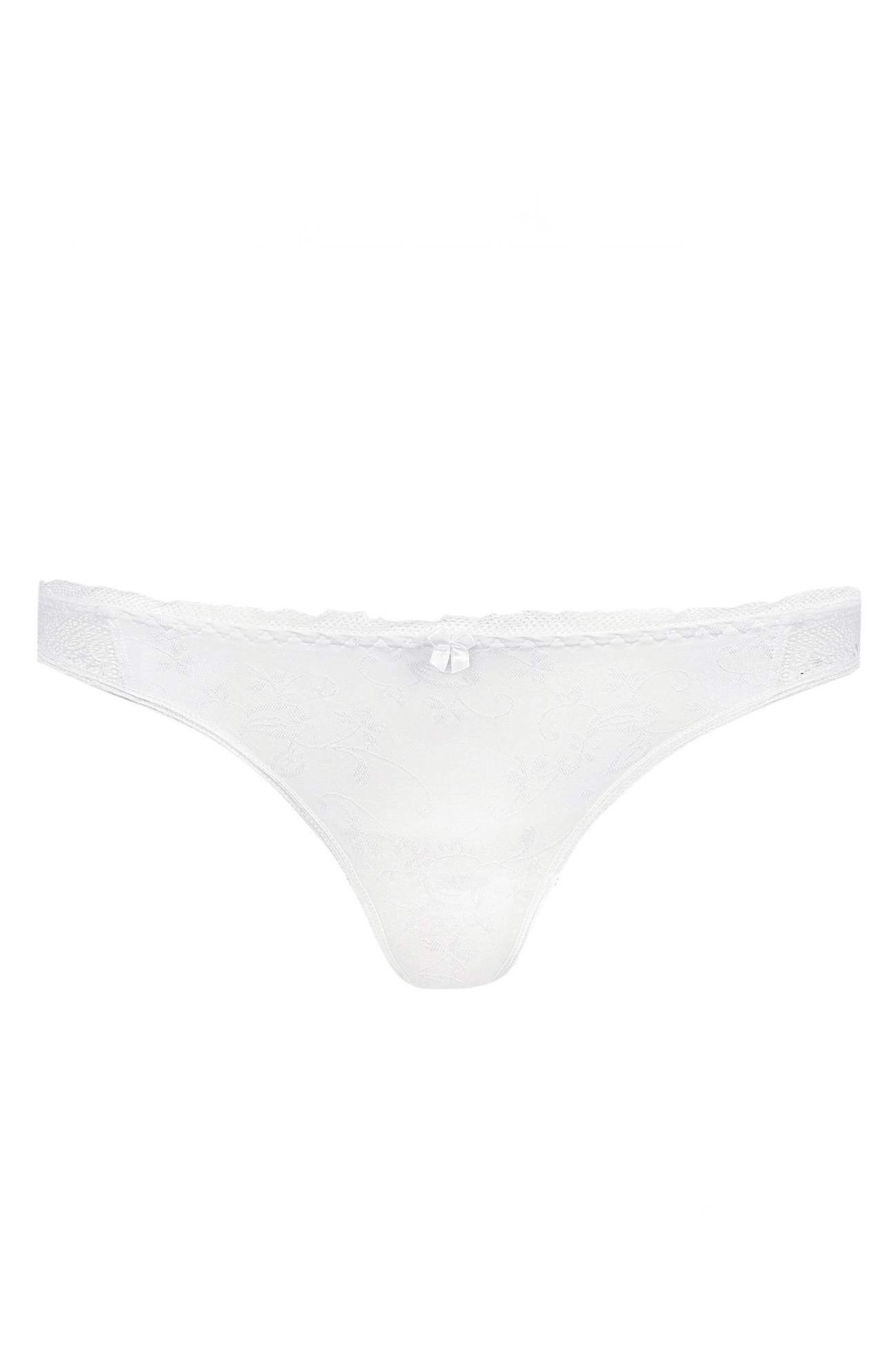 Klasyczne stringi wykonane z delikatnej dzianiny typu żakard ozdobionej kwiatowym motywem. Boczki oraz górną linię majteczek zdobi subtelna koronka.