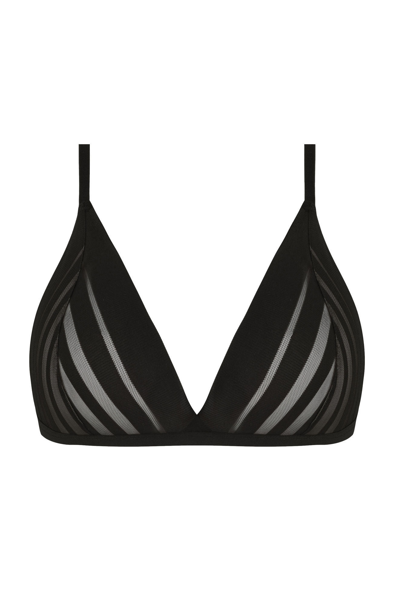 • Trójkątne miski oraz tył uszyte z częściowo prześwitującego materiału we wzór pasków,