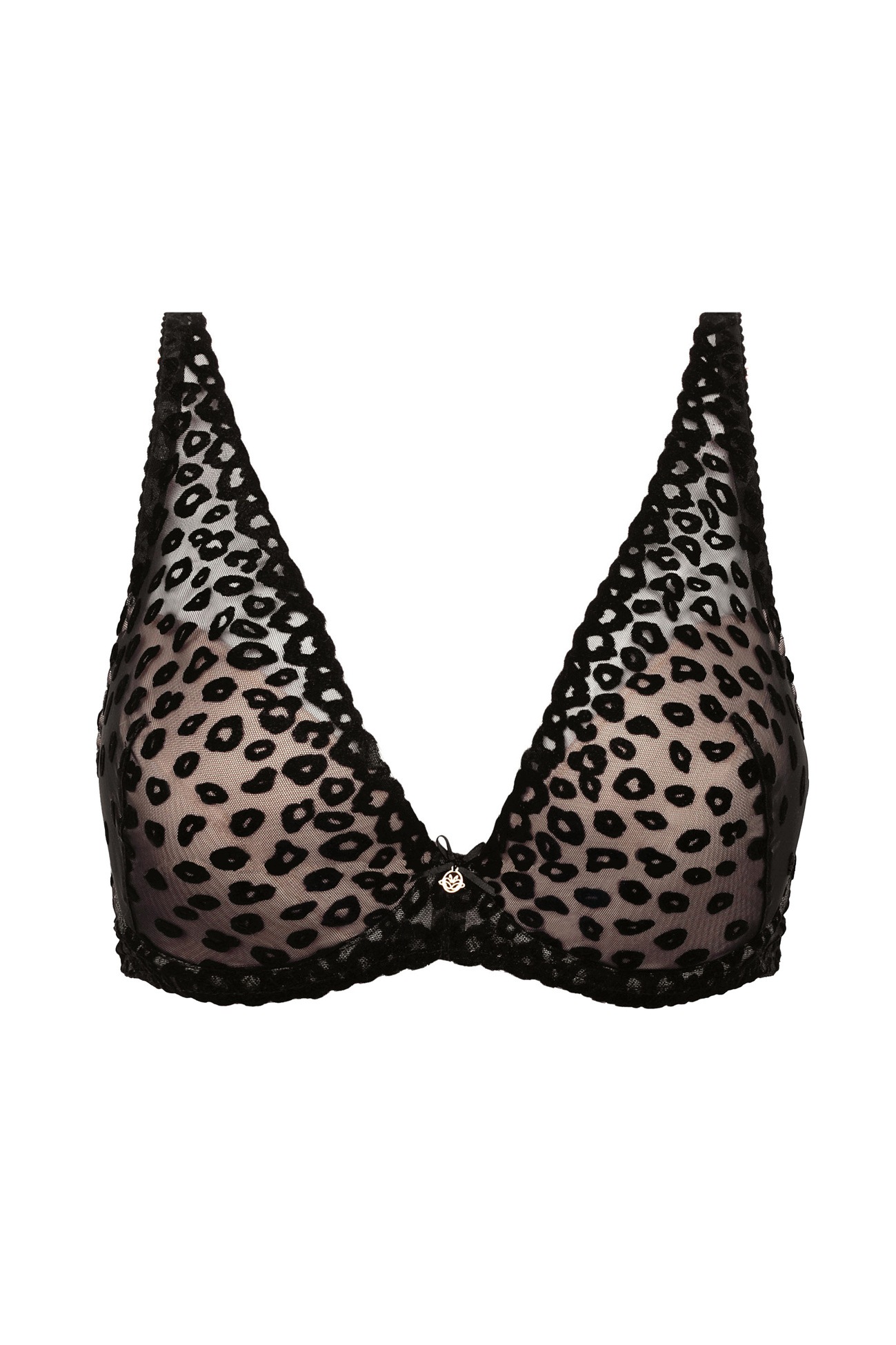 Uwodzicielski biustonosz push-up pięknie eksponuje biust nadając piersiom ładny, zaokrąglony kształt. Miseczki obszyte czarnym tiulem pokrytym przyjemnym flokiem w zwierzęce cętki.