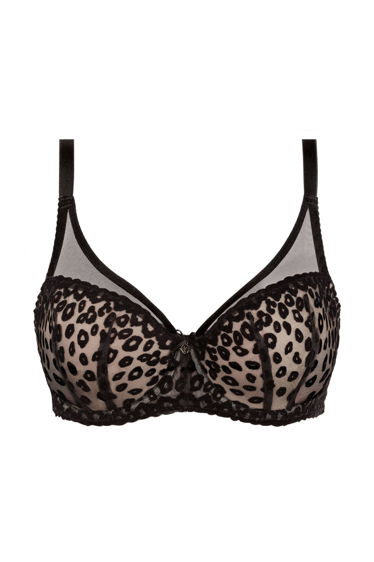 Uwodzicielski biustonosz usztywniany doskonale modeluje piersi. Miseczki obszyte czarnym tiulem pokrytym przyjemnym flokiem w zwierzęce cętki.
