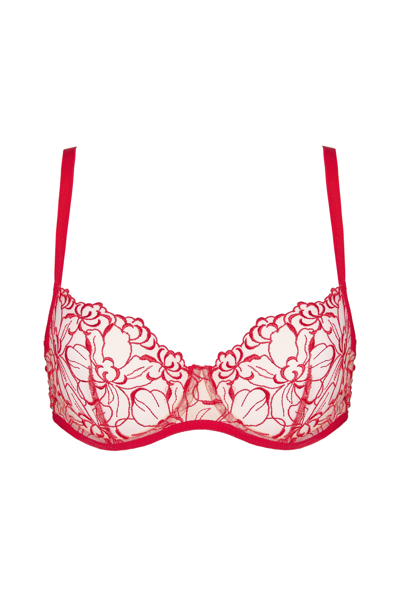 <p>Uwodzicielski biustonosz miękki nadaje piersiom naturalny kształt, delikatnie go unosi i lekko zbiera do środka. Wykonany z wyjątkowego haftu o kwiatowym wzorze.</p><ul><li>Półprzeźroczyste miseczki jednoczęściowe z cięciem pionowym,</li><li>Plecy biustonosza wykonane z elastycznego tiulu ozdobione wstawką z paseczków,</li><li>Regulowane, nieodpinane ramiączka,</li><li>Pionowe fiszbiny boczne zapobiegające marszczeniu się boczków.</li></ul>