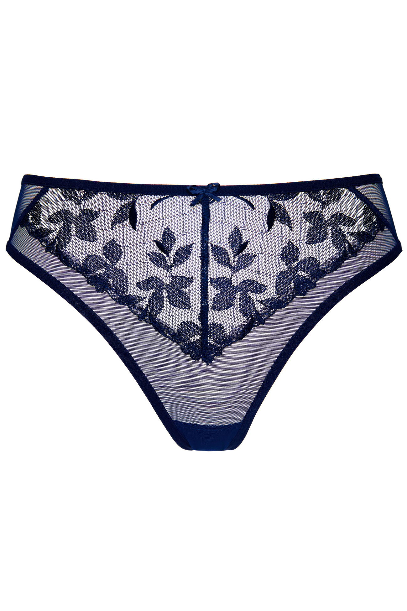 Eleganckie stringi wykonane z plenu ozdobionego pięknym haftem o kwiatowym wzorze oraz elastycznego tiulu.