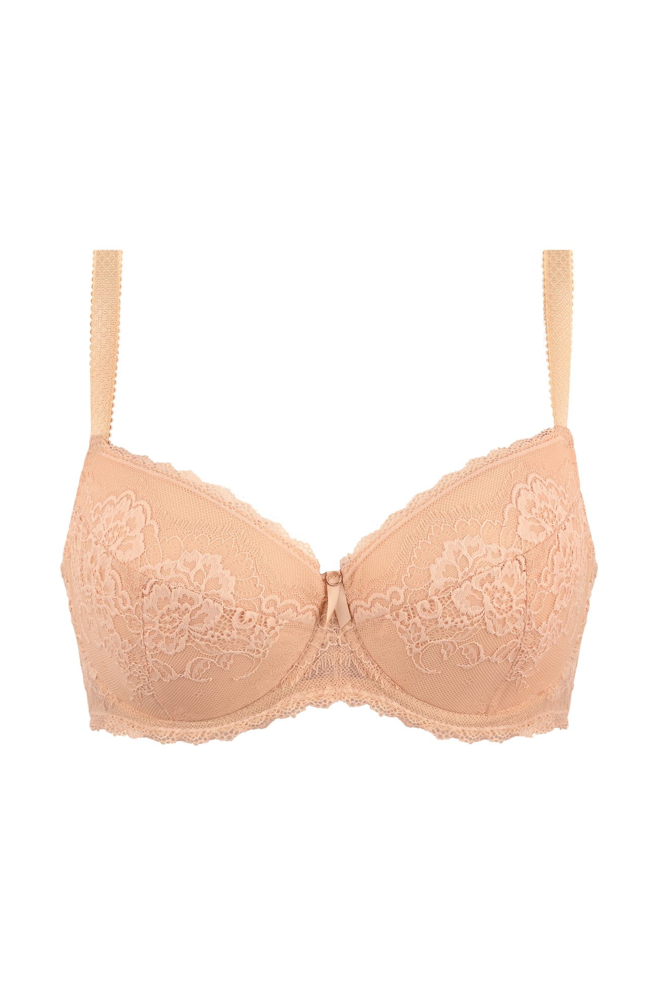 Dziewczęcy biustonosz usztywniany doskonale modeluje piersi. Miseczki obszyto koronką o subtelnym, kwiatowym wzorze.