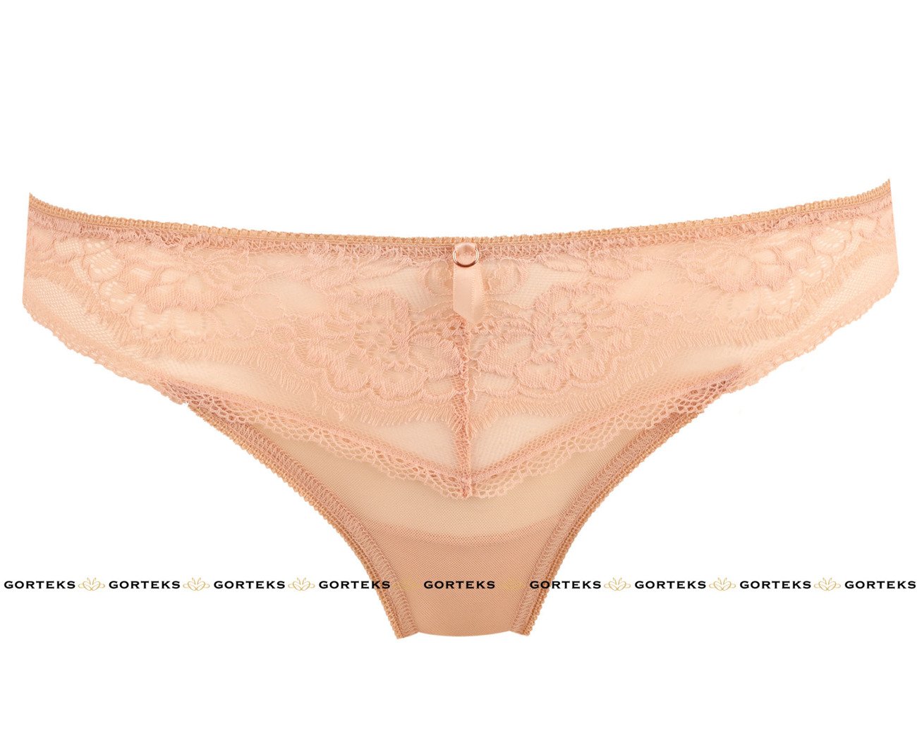 Dziewczęce stringi wykonane z pudrowej koronki o romantycznym kwiatowym wzorze.