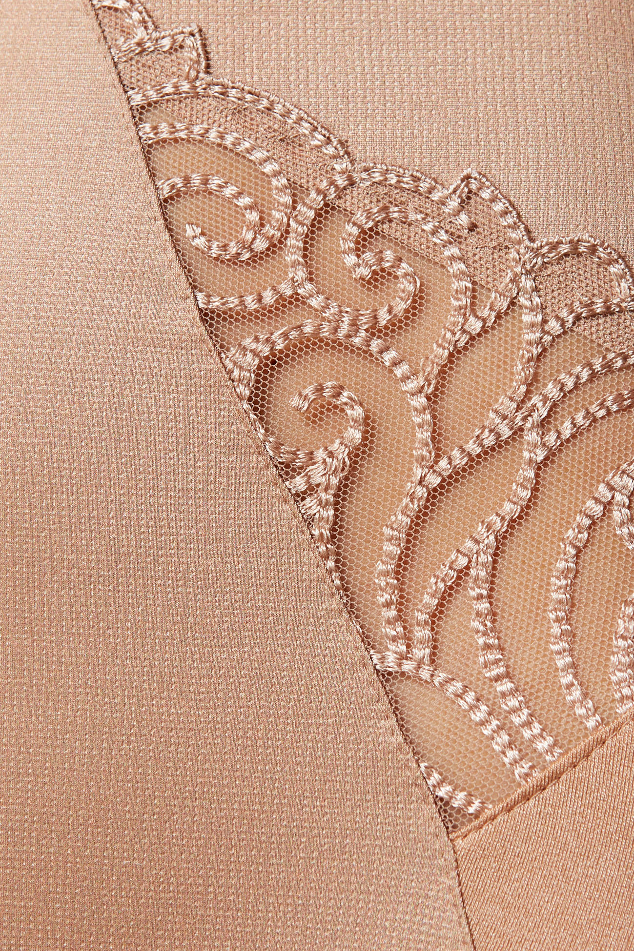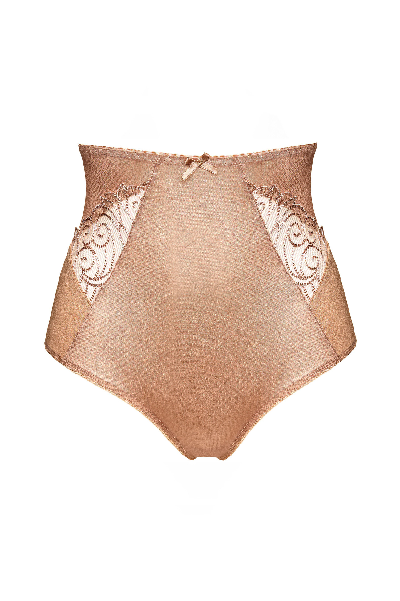 • Wysokie figi z gładkiej dzianiny oraz haftu,
