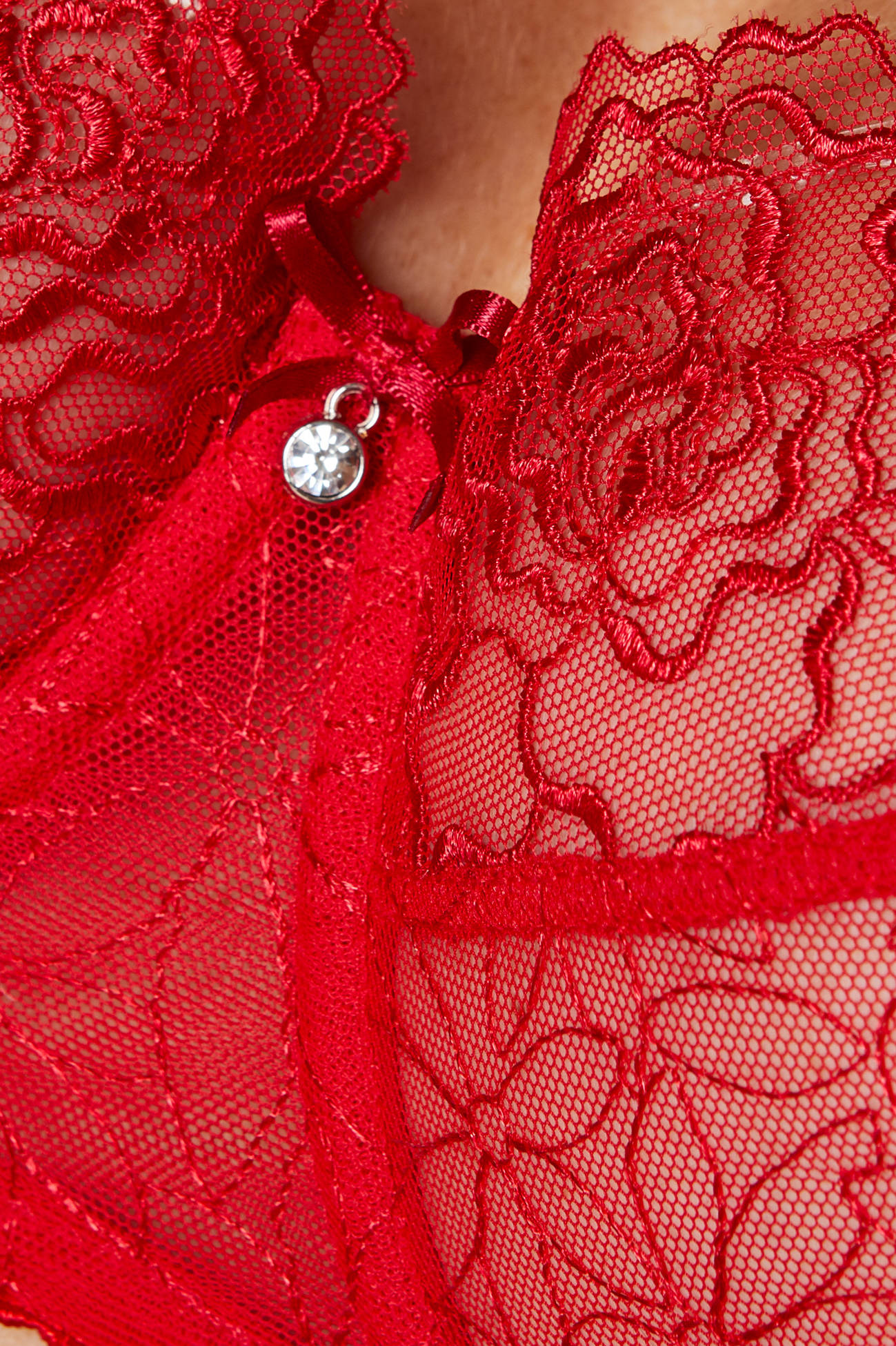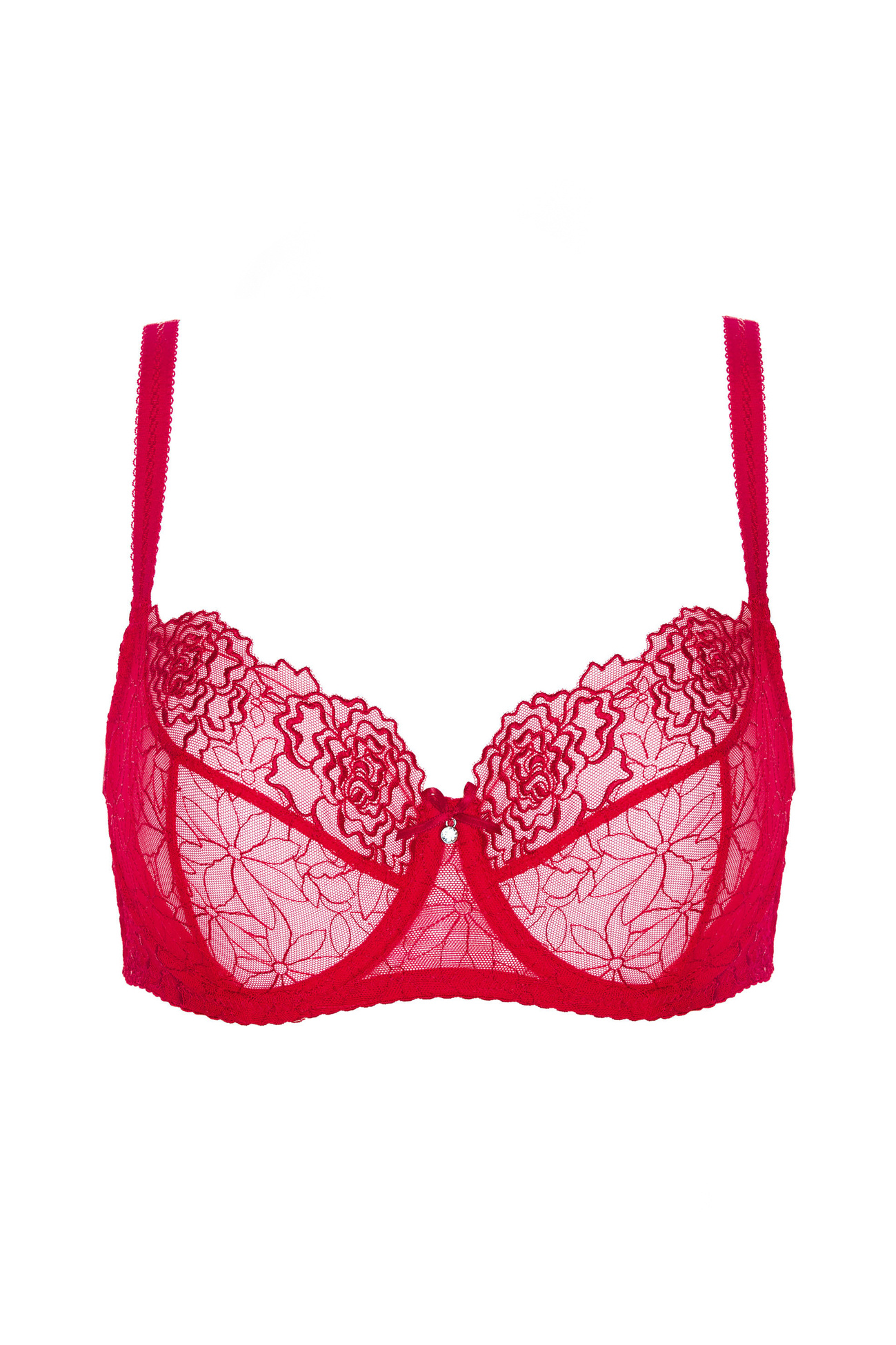 • Miękkie miseczki o kroju balkonetki wykonane z półprzeźroczystego haftu o subtelnym, kwiatowym wzorze,