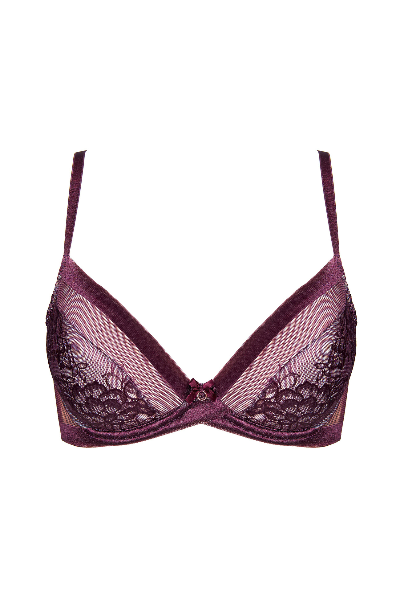 Uwodzicielski biustonosz push-up pięknie eksponuje biust nadając piersiom ładny, zaokrąglony kształt. Miseczki obszyte oryginalną koronką z motywem kwiatowym o satynowym wykończeniu.