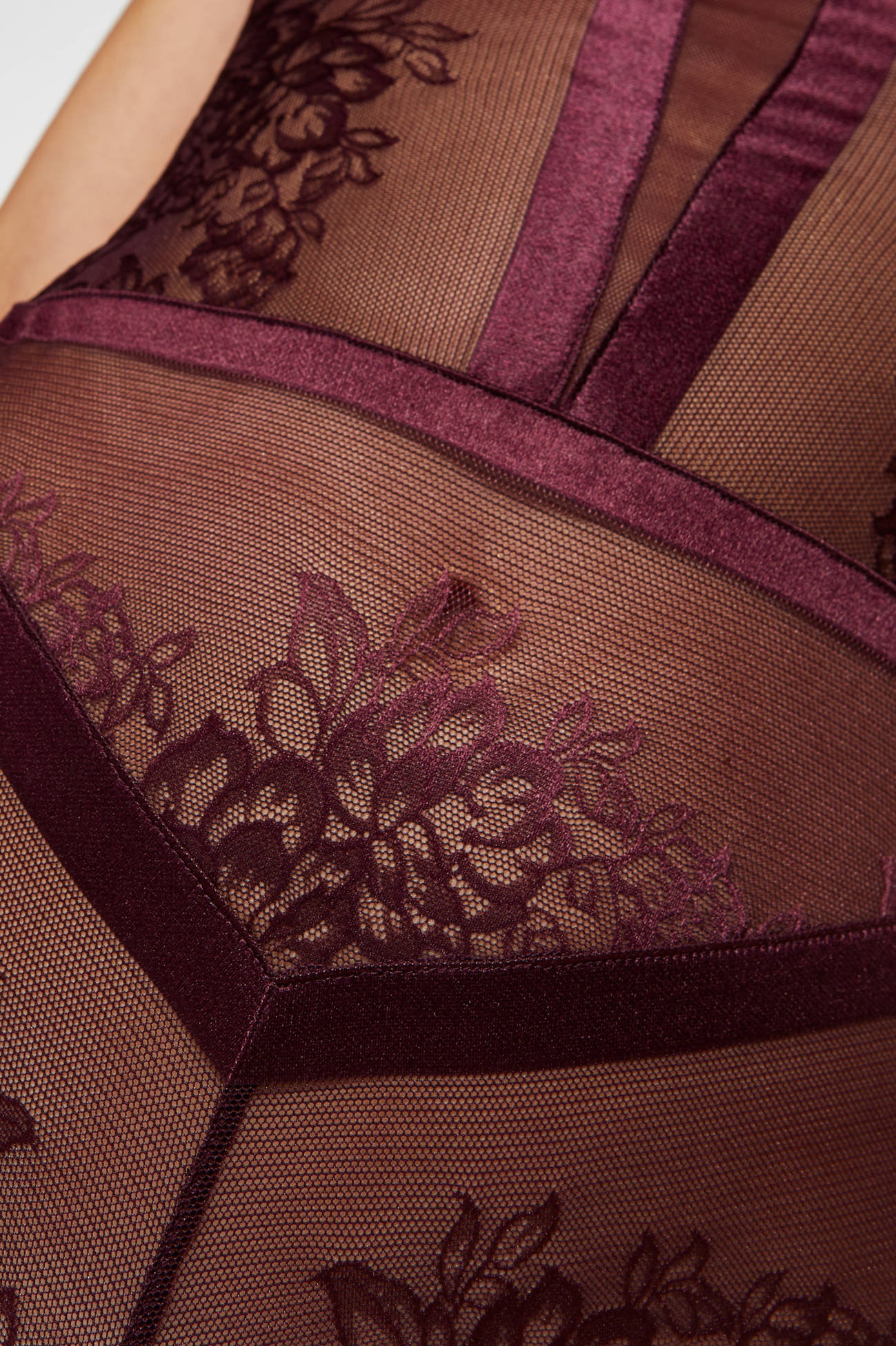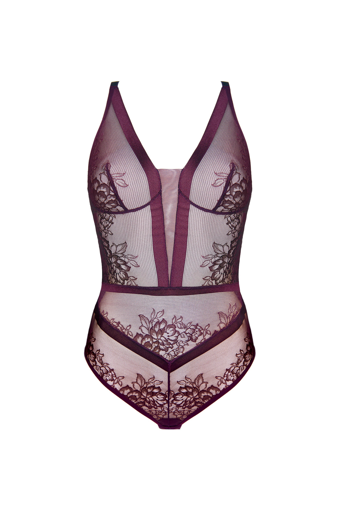 Uwodzicielskie body delikatnie modeluje sylwetkę. Wykonane z elastycznej koronki o kwiatowym wzorze i satynowym wykończeniu.