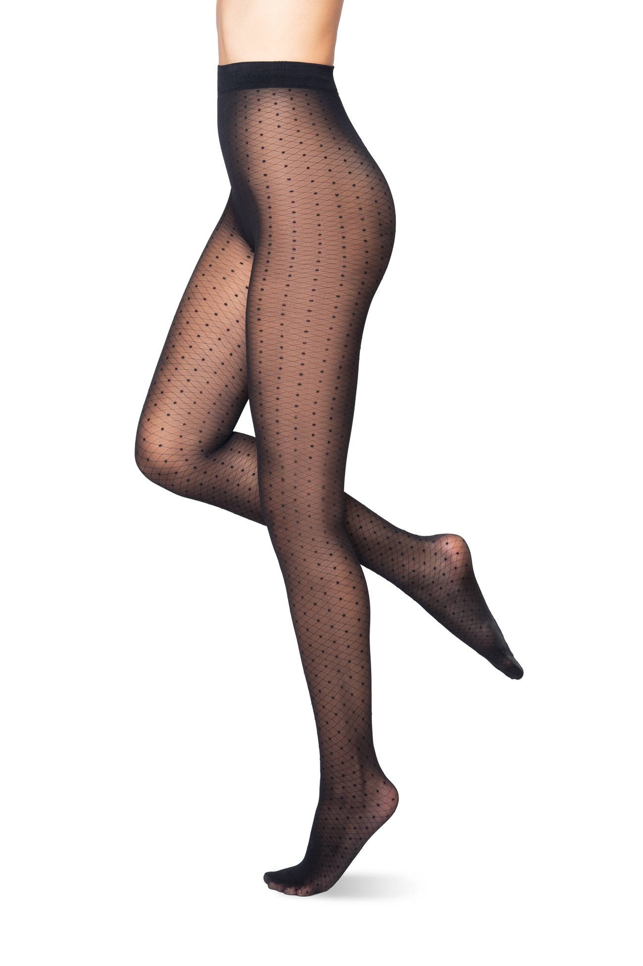 Wzorzyste rajstopy w kropeczki i delikatną krateczkę wykonane z włókna Lycra tworzą na nodze ciekawy efekt.
