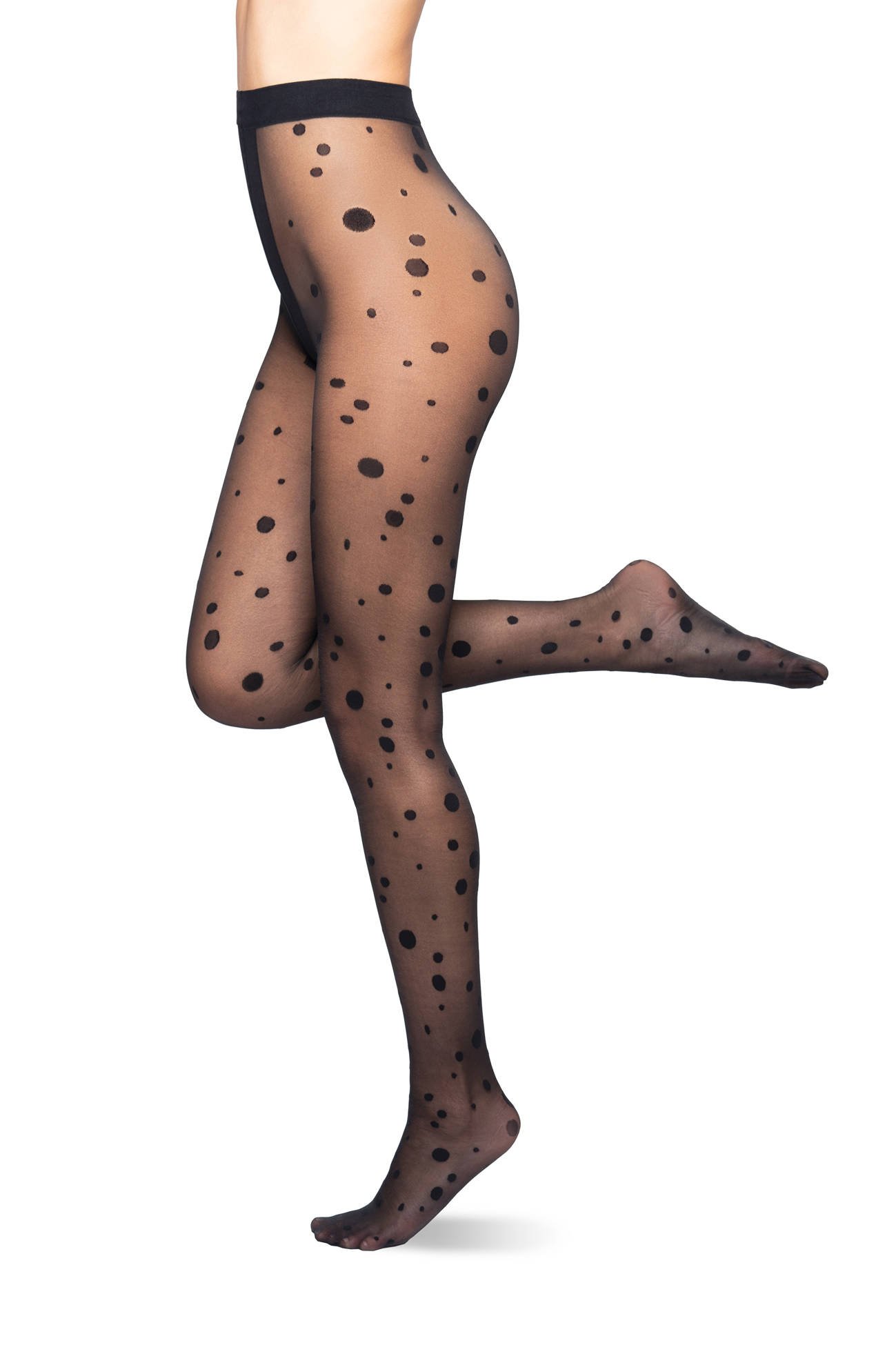 Urocze rajstopy w nieregularne kropki z włókna LYCRA podwójnie oplecionego jedwabiem poliamidowym.
