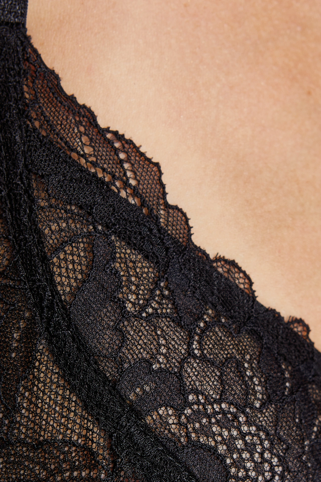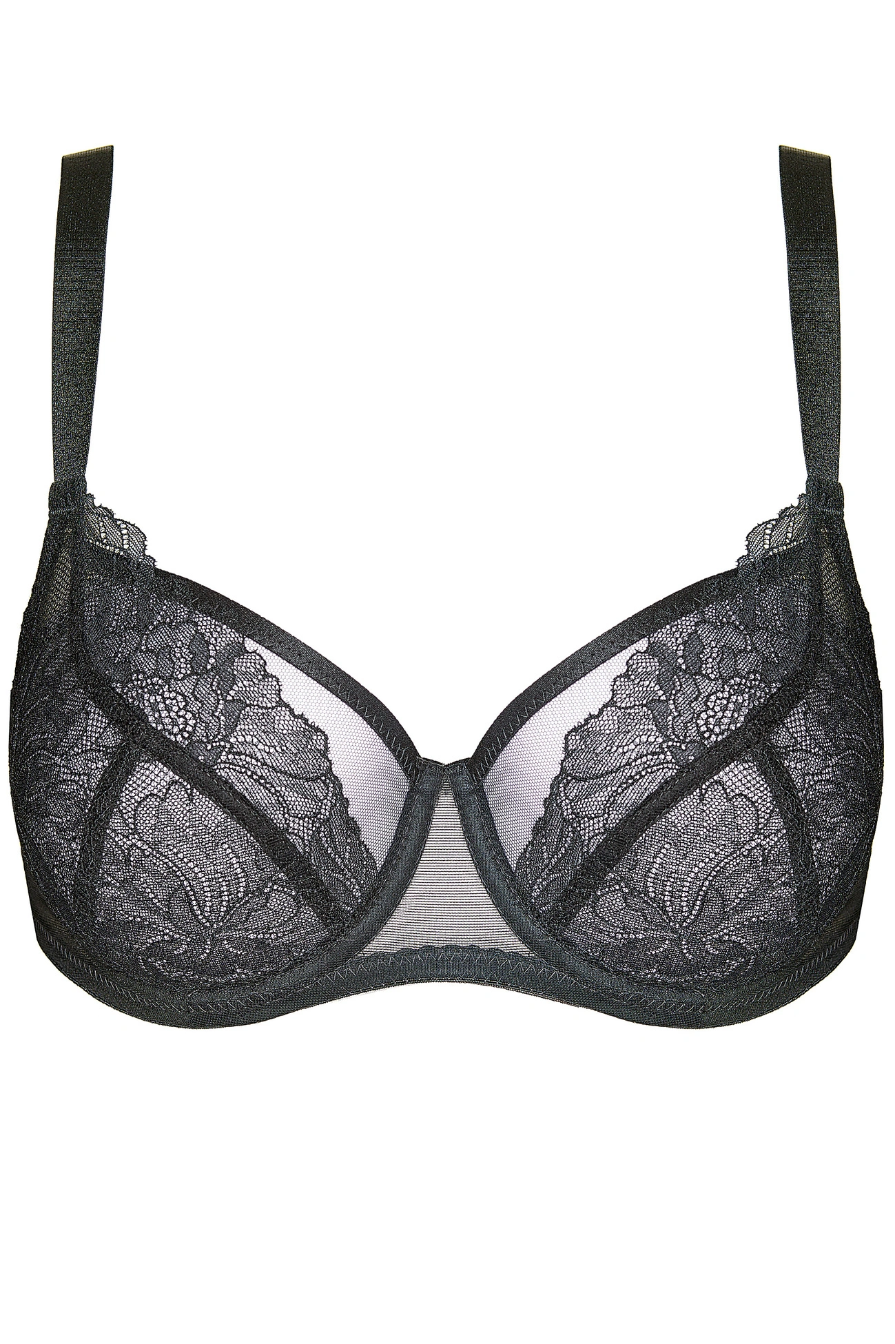 Konstrukcja misek oparta na trzech częściach z transparentnego tiulu oraz subtelnej koronki o motywie roślinnym, zapewnia naturalne uniesienie i piękne uformowanie biustu,