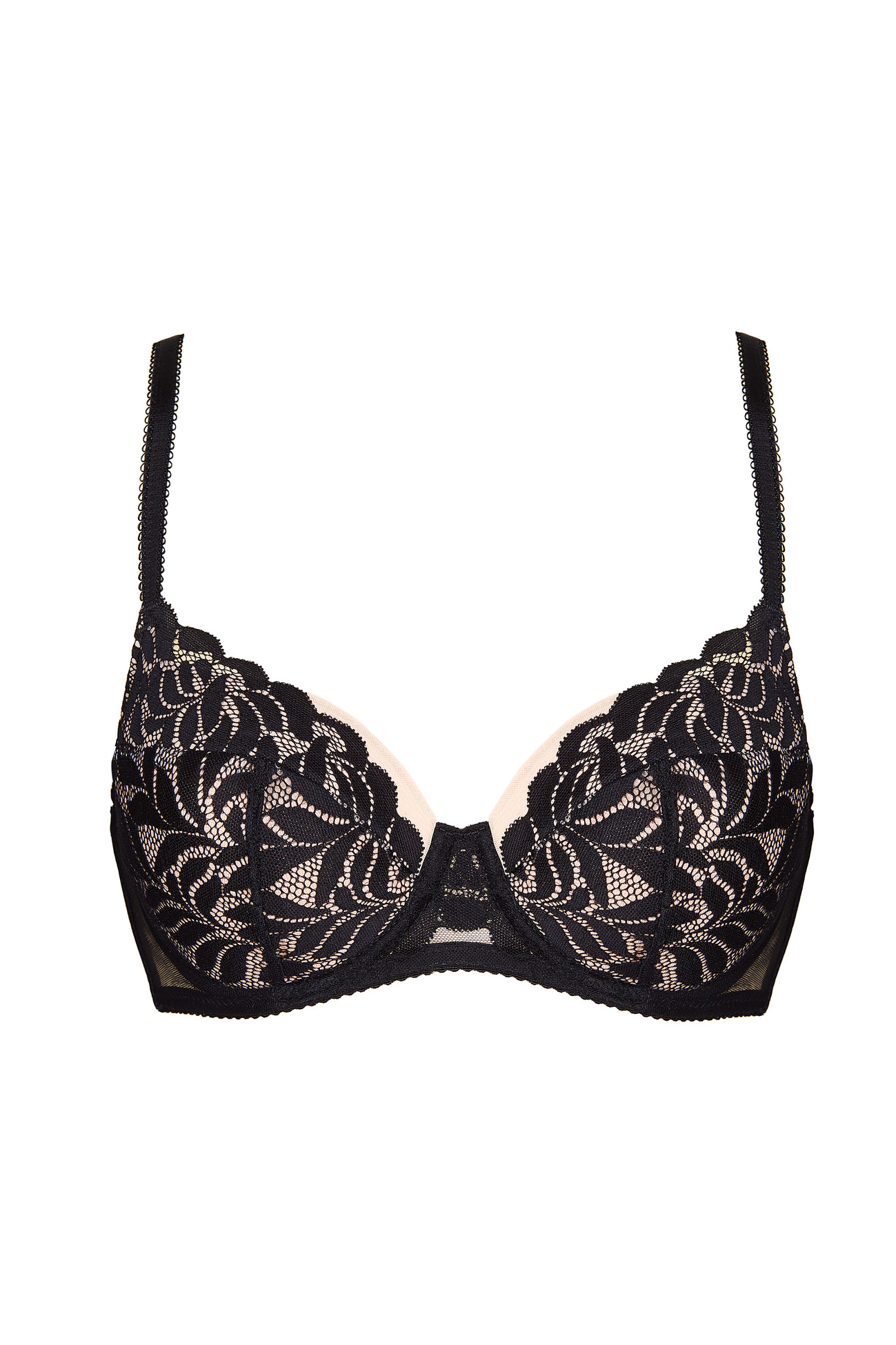 Kobiecy biustonosz usztywniany doskonale podkreśla większy biust. Miseczki zostały wykonane z pianki gorseciarskiej obszytej ozdobną, elastyczną koronką.