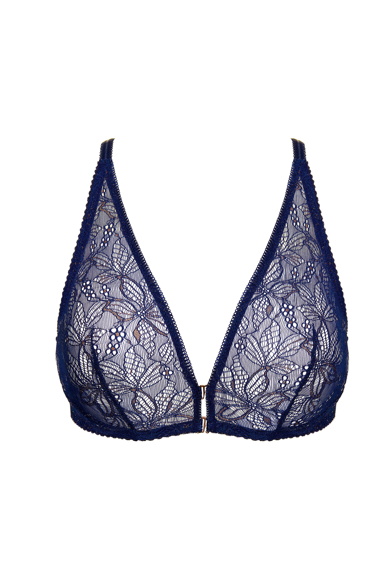 <ul><li>Miękka, granatowa koronka przeplatana metalicznymi nićmi,</li><li>Miedziane detale biustonosza dopasowane kolorystycznie do koronki,</li><li>Oryginalne, podwójne zapięcie w formie zaczepów z przodu biustonosza, </li><li>Biustonosz zaprojektowano i uszyto w Polsce, </li><li>W celu utrzymania bielizny w dobrej kondycji przez długi czas zaleca się delikatne pranie ręczne w temperaturze 30°,</li><li>Modelka Gabriela ma 174 cm wzrostu i nosi rozmiar 70E.</li></ul>