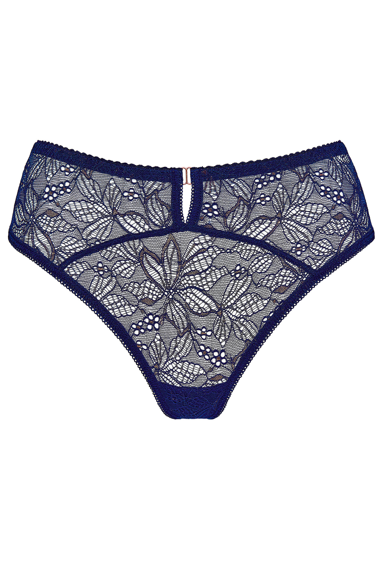 • Miękka, granatowa koronka przeplatana metalicznymi nićmi,