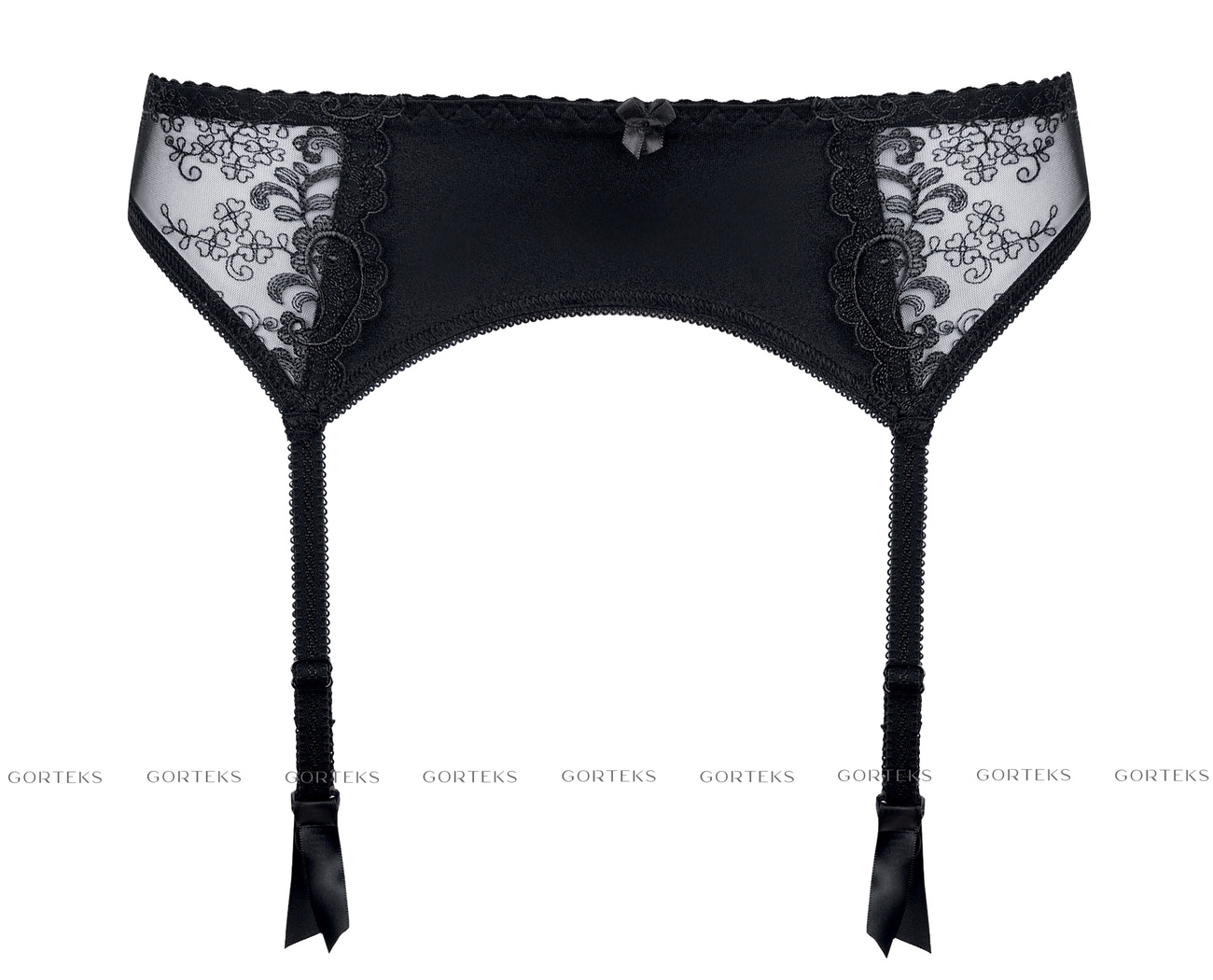 Klasyczny niski pas do pończoch wykonany z dzianiny gładkiej połączonej z tiulem elastycznym. Ozdobiony delikatnym haftem o motywie kwiatowym.